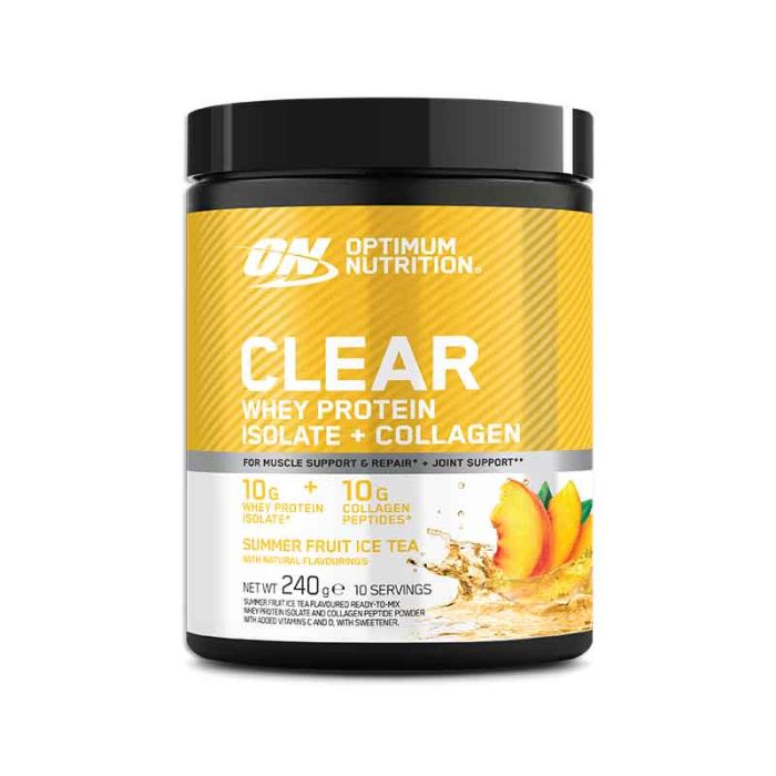 O Clear Whey Isolate + Collagen é uma fórmula de desempenho refrescante e naturalmente com sabor de frutas construída em torno das fundações do seu corpo. Com 10g de peptídeos de colágeno e vitamina C, suporta a cartilagem que assume o estresse durante o movimento *.